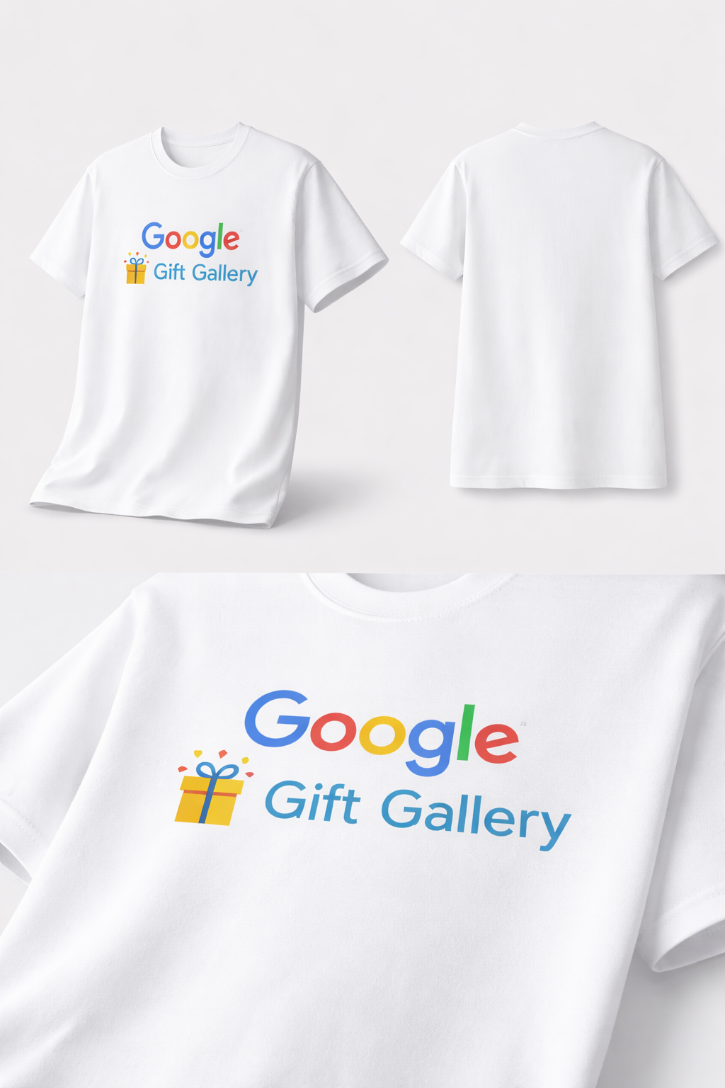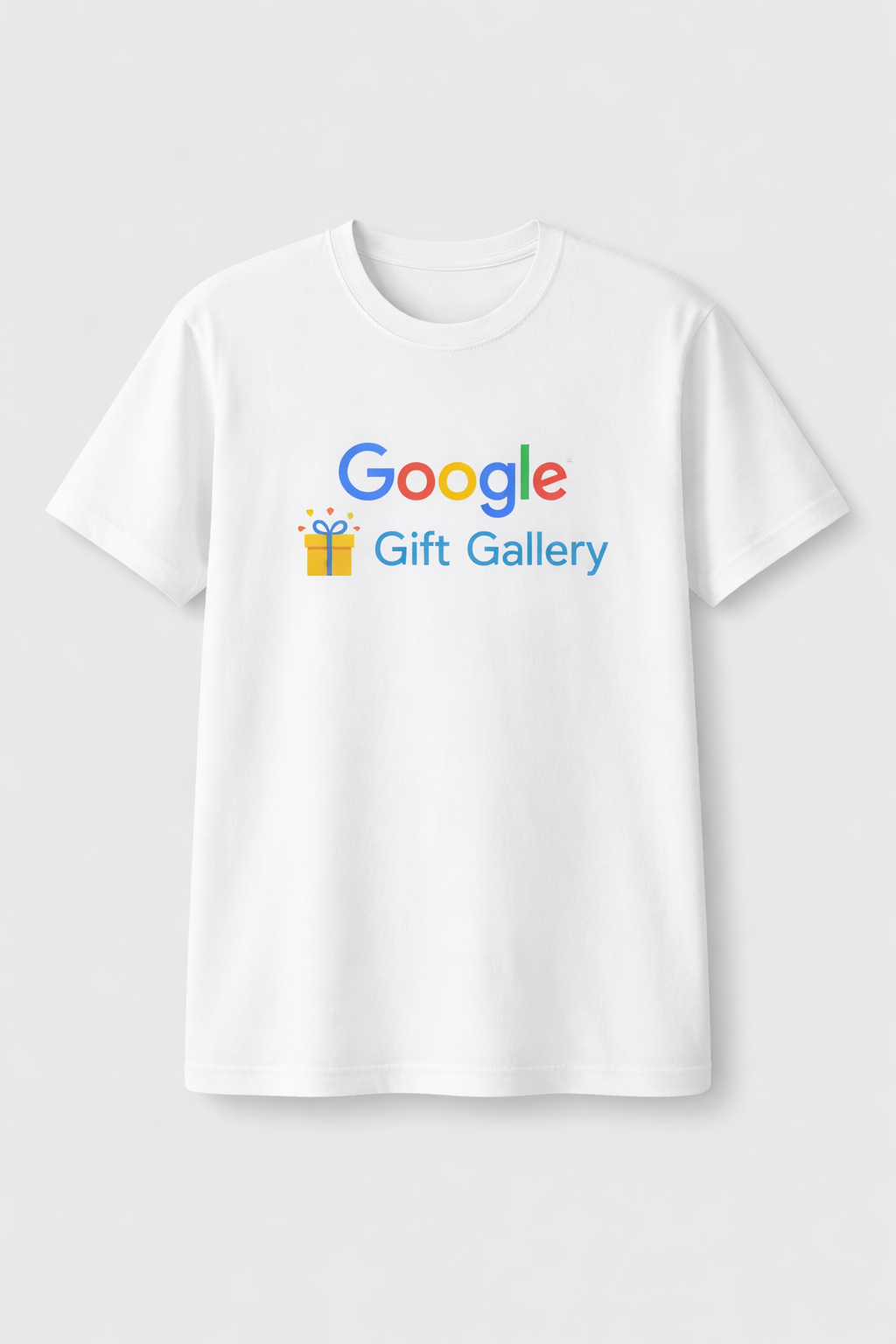 A classic white unisex T-shirt featuring the Google Gift Gallery logo, designed for everyday comfort and modern style. 100% Organic cotton.